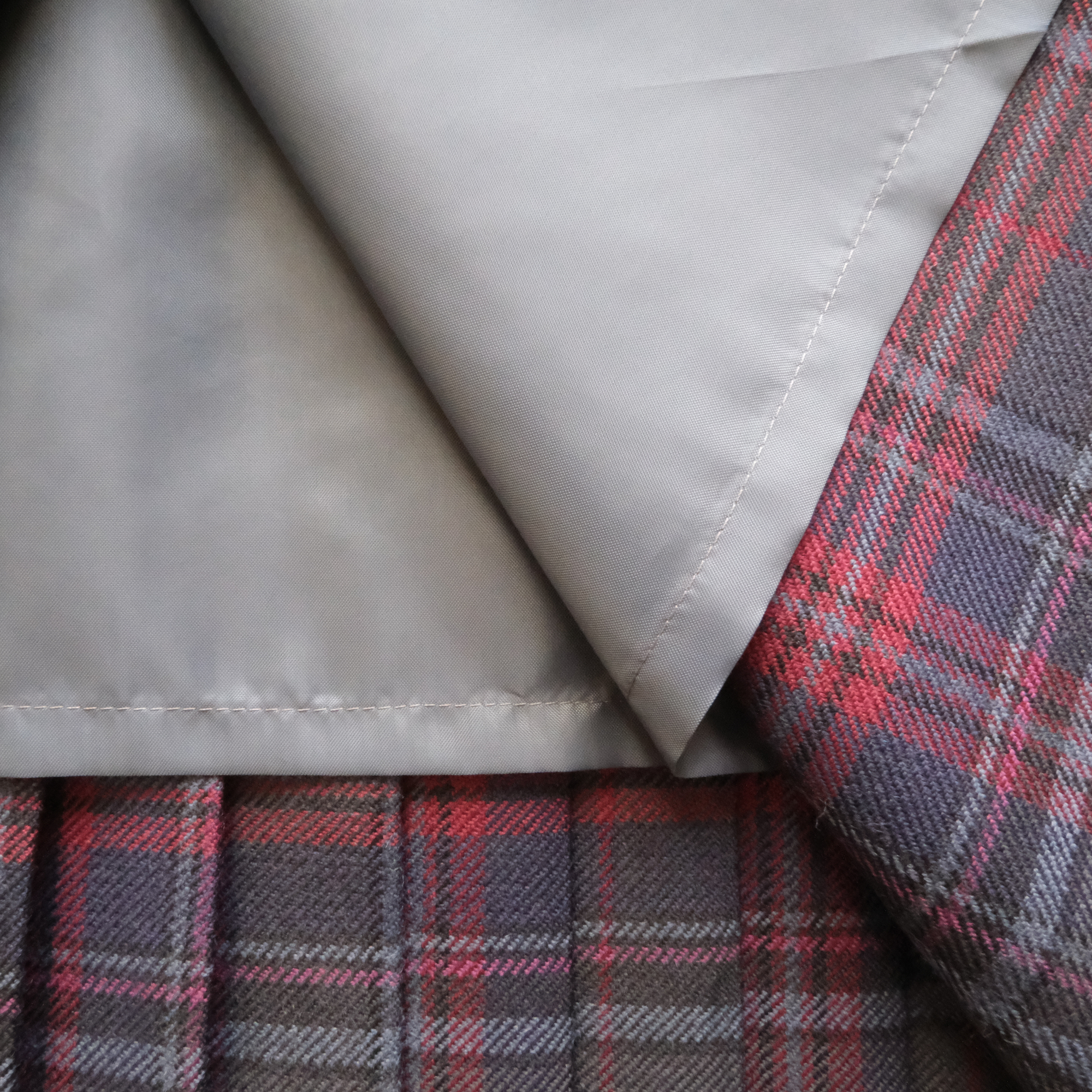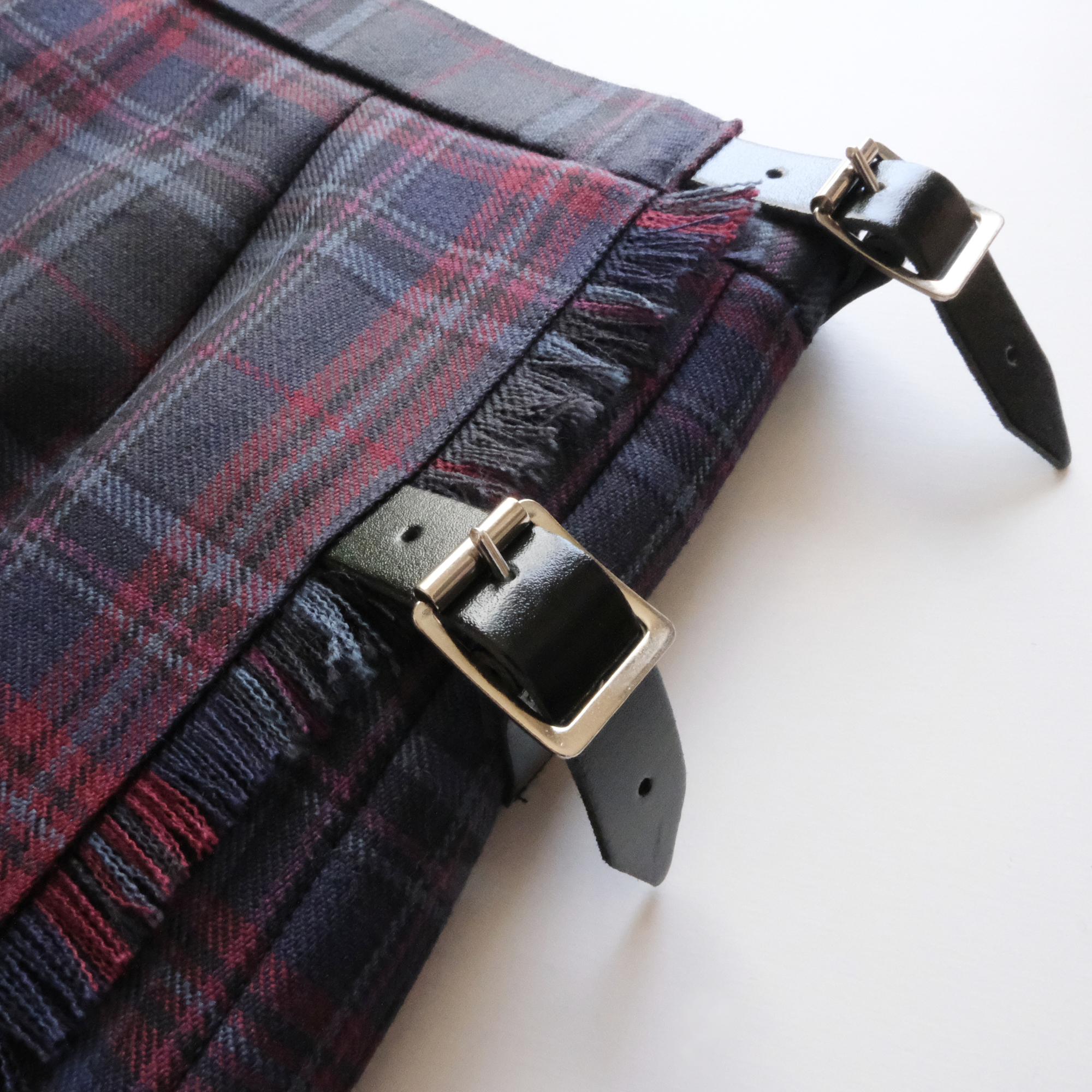 前エプロンにはフリンジを施し、ウエスト部分にはイギリスから輸入した革ベルトを付けました。本物のキルトを見本に、後面のプリーツは歩行時に美しくなびくように設計しています。伝統衣装の原型を残しつつ、より美しいボディラインを表現するため、前面のエプロンにダーツを入れ、ウエストに引き締まった印象を与えます。さらにウエストベルトに目立たぬよう小さなゴムを入れ伸縮性を出し、1日中着ていても着心地の良い巻きスカートとなっています。両端の革ベルトで約8センチの幅が調整可能なため、少々の体型変化もカバーすることができ、長年に渡って愛用いただけます。